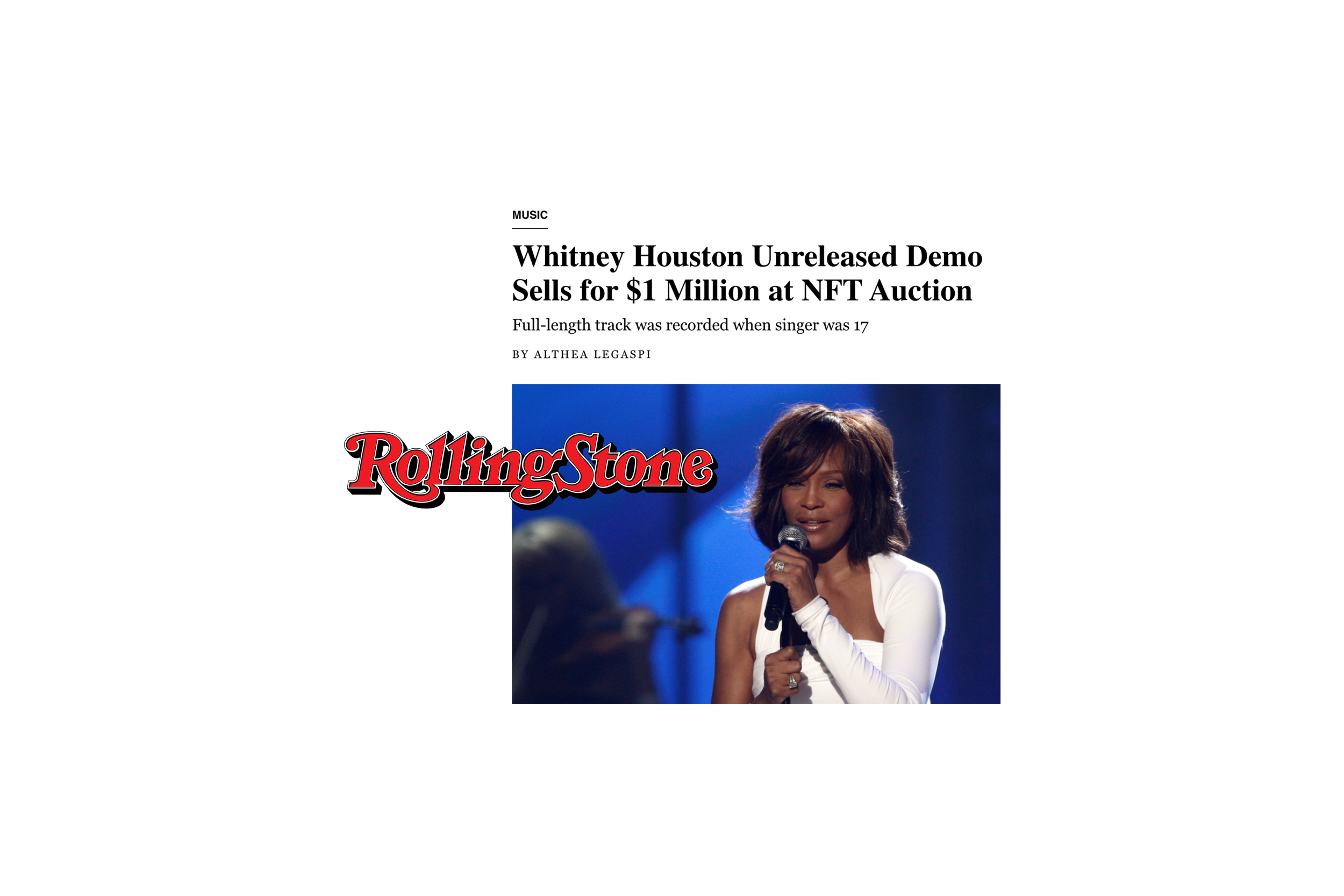 The collection by then 17-year-old artist Diana Sinclair was centered around an unreleased demo recorded by then 17-year-old Whitney Houston, before she was βthe Voice.β A transhistorical creative conversation between two leading female voices. The 1/1 unreleased demo and video artwork achieved $1m USD at auction on Tezos, a record for a female digital artist.